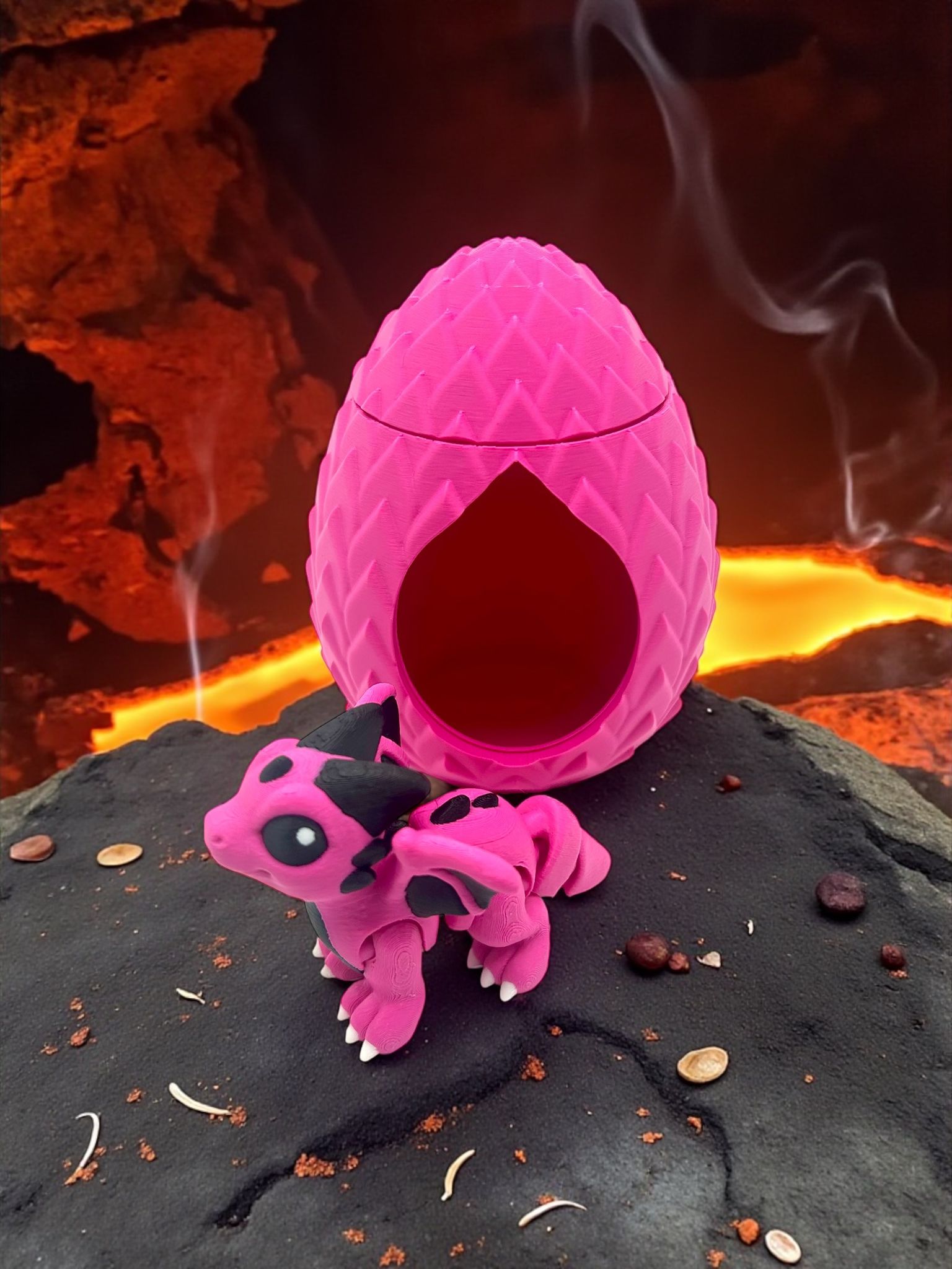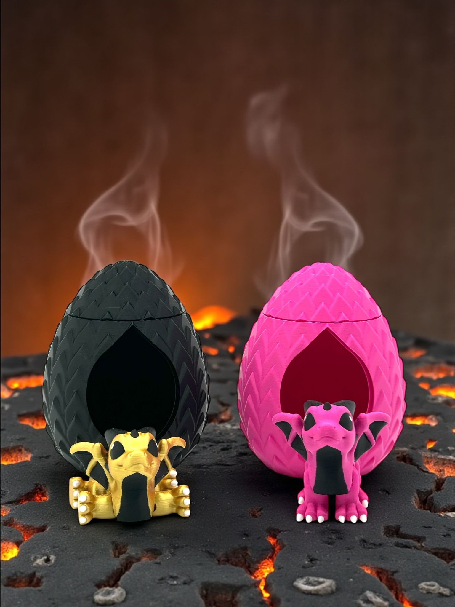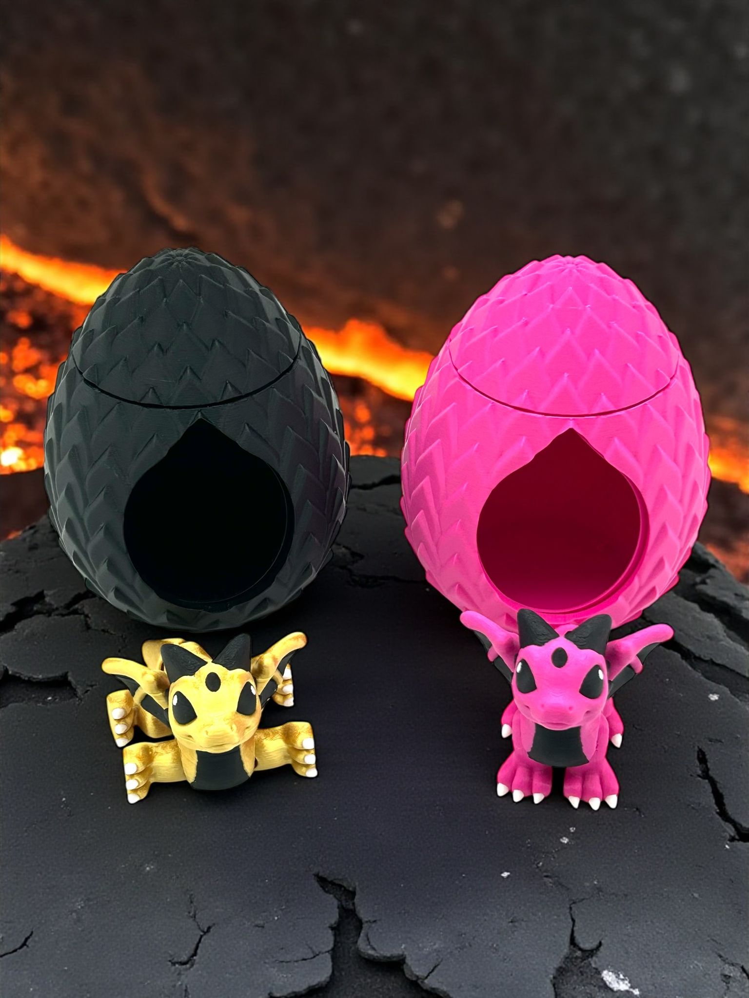 Jedes Drachen-Ei ist detailreich gestaltet und wird von einem kleinen Drachen begleitet – wahlweise in mystischem Schwarz mit goldenem Drachen oder in kräftigem Pink mit pinkem Drachen. Perfekt für Fantasy-Liebhaber, Sammler oder als außergewöhnliches Geschenk.
