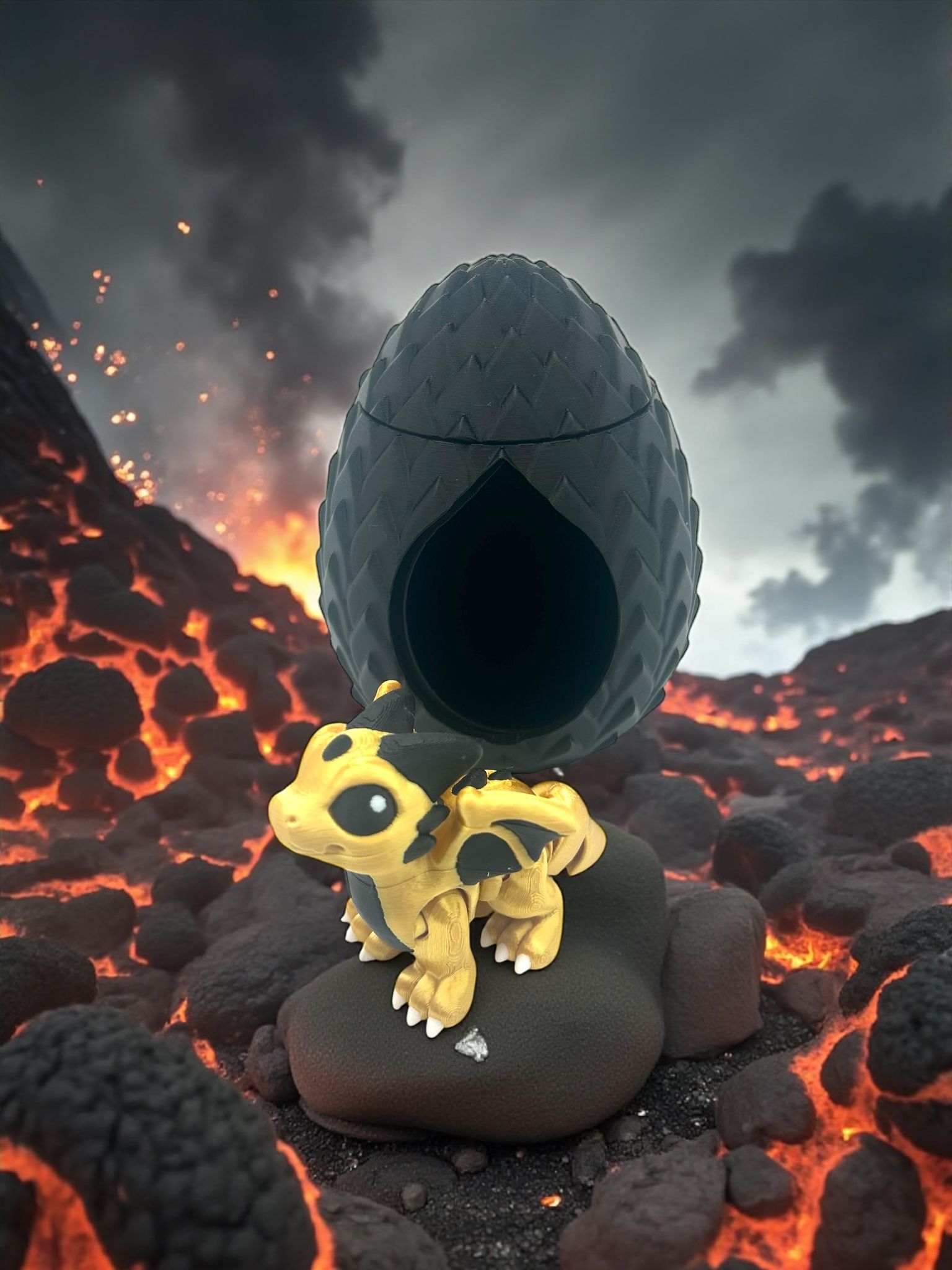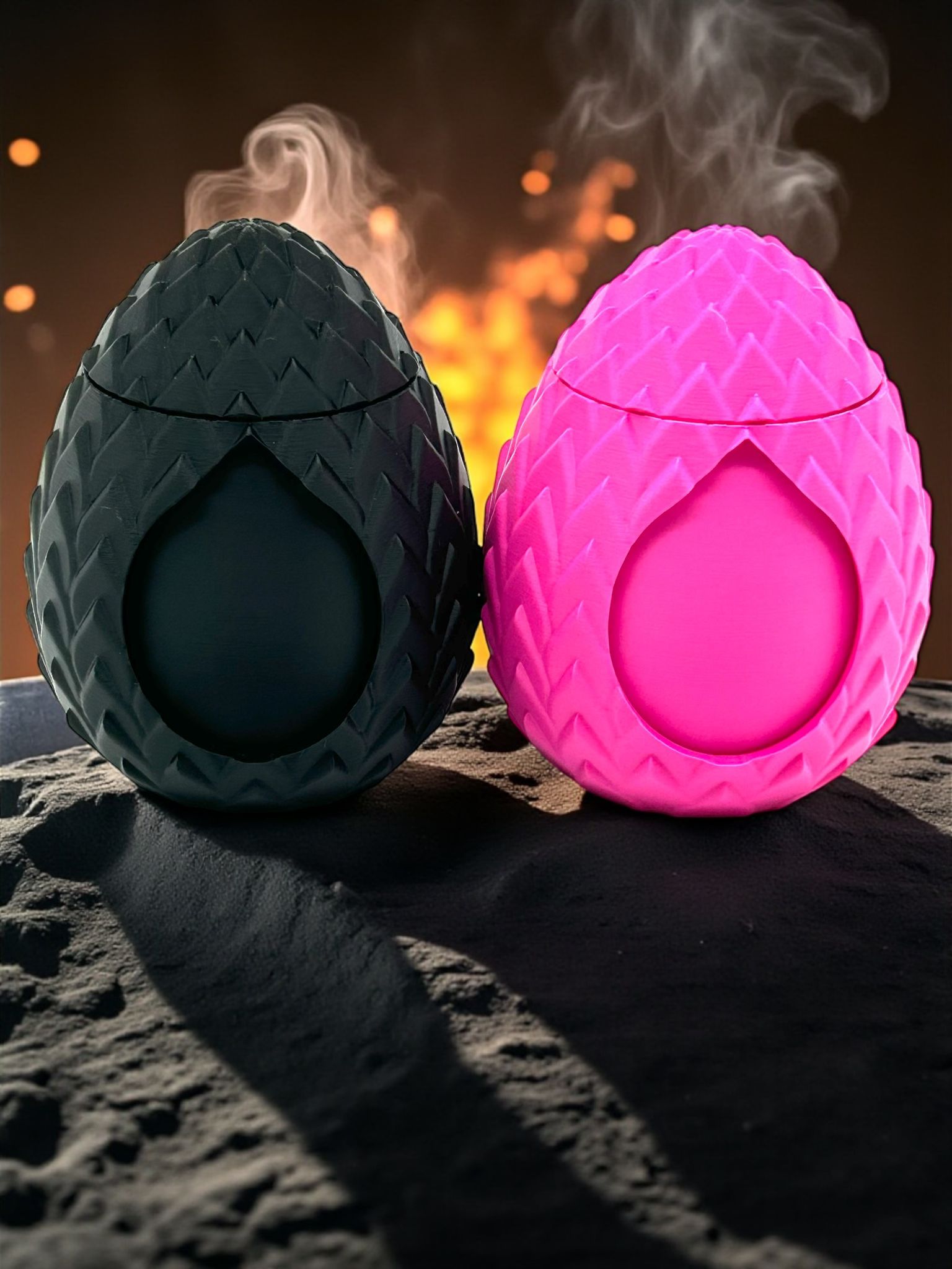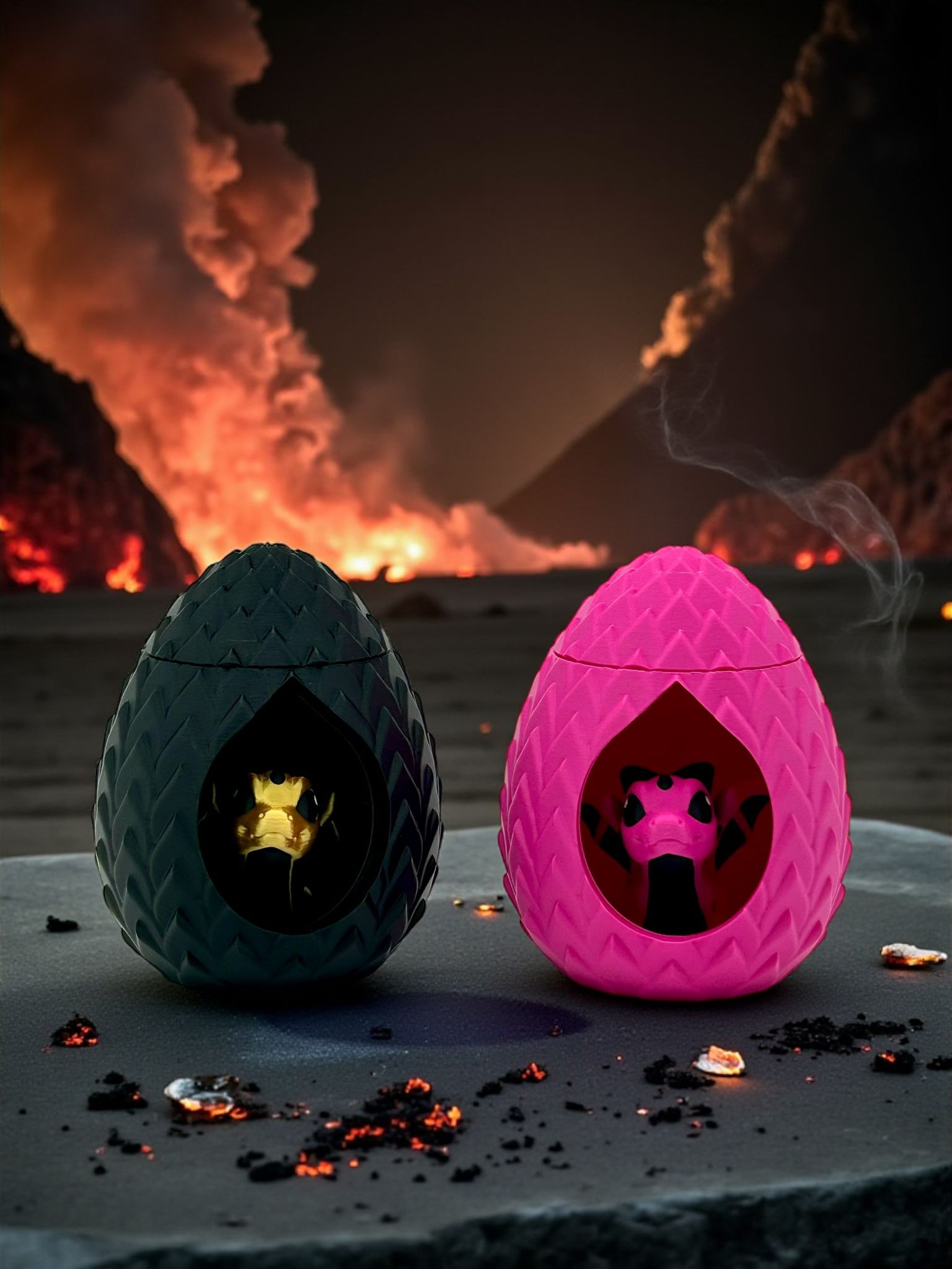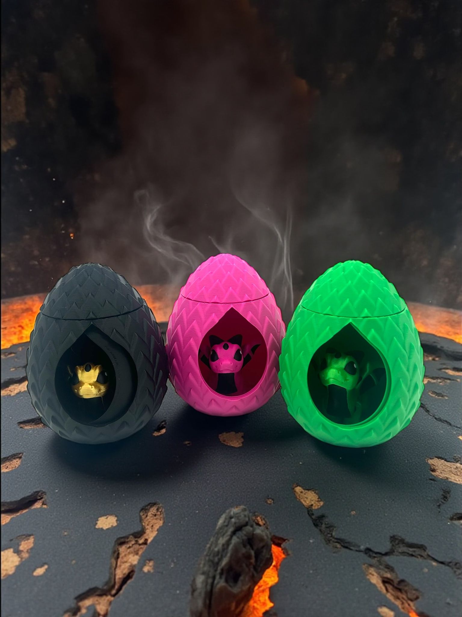 Jedes Drachen-Ei ist detailreich gestaltet und wird von einem kleinen Drachen begleitet – wahlweise in mystischem Schwarz mit goldenem Drachen oder in kräftigem Pink mit pinkem Drachen. Perfekt für Fantasy-Liebhaber, Sammler oder als außergewöhnliches Geschenk.
